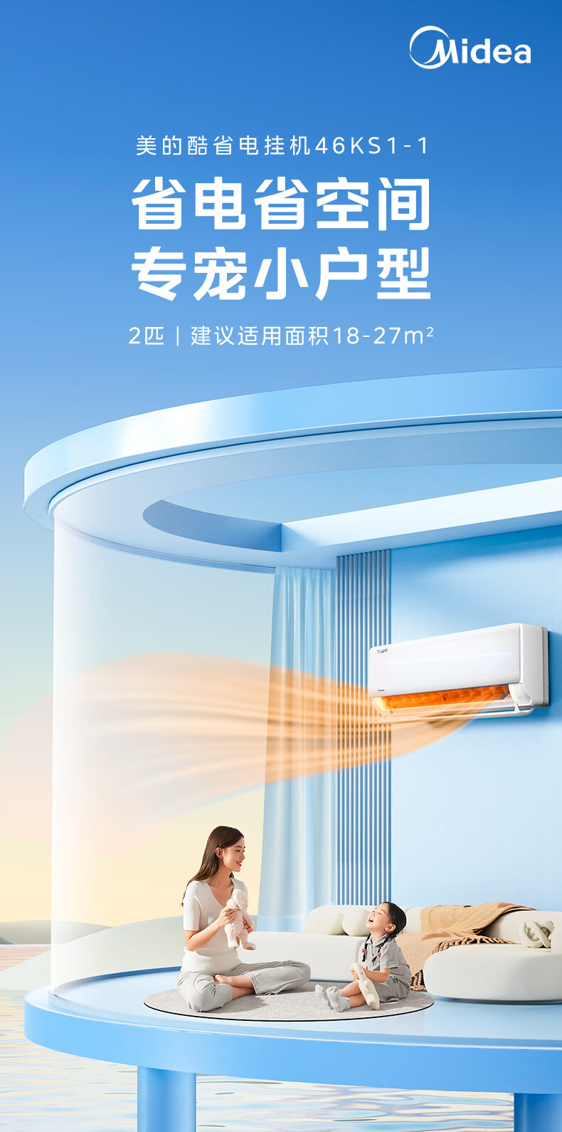 商品名称:美的空调 酷省电 2匹 新一级能效变频 冷暖大卧室27㎡ 双排纯铜管 空调挂机国家补贴 KFR-46GW/N8KS1-1